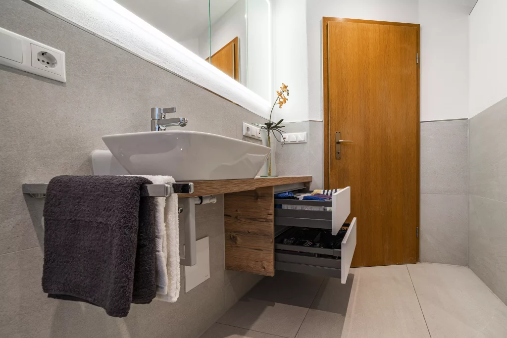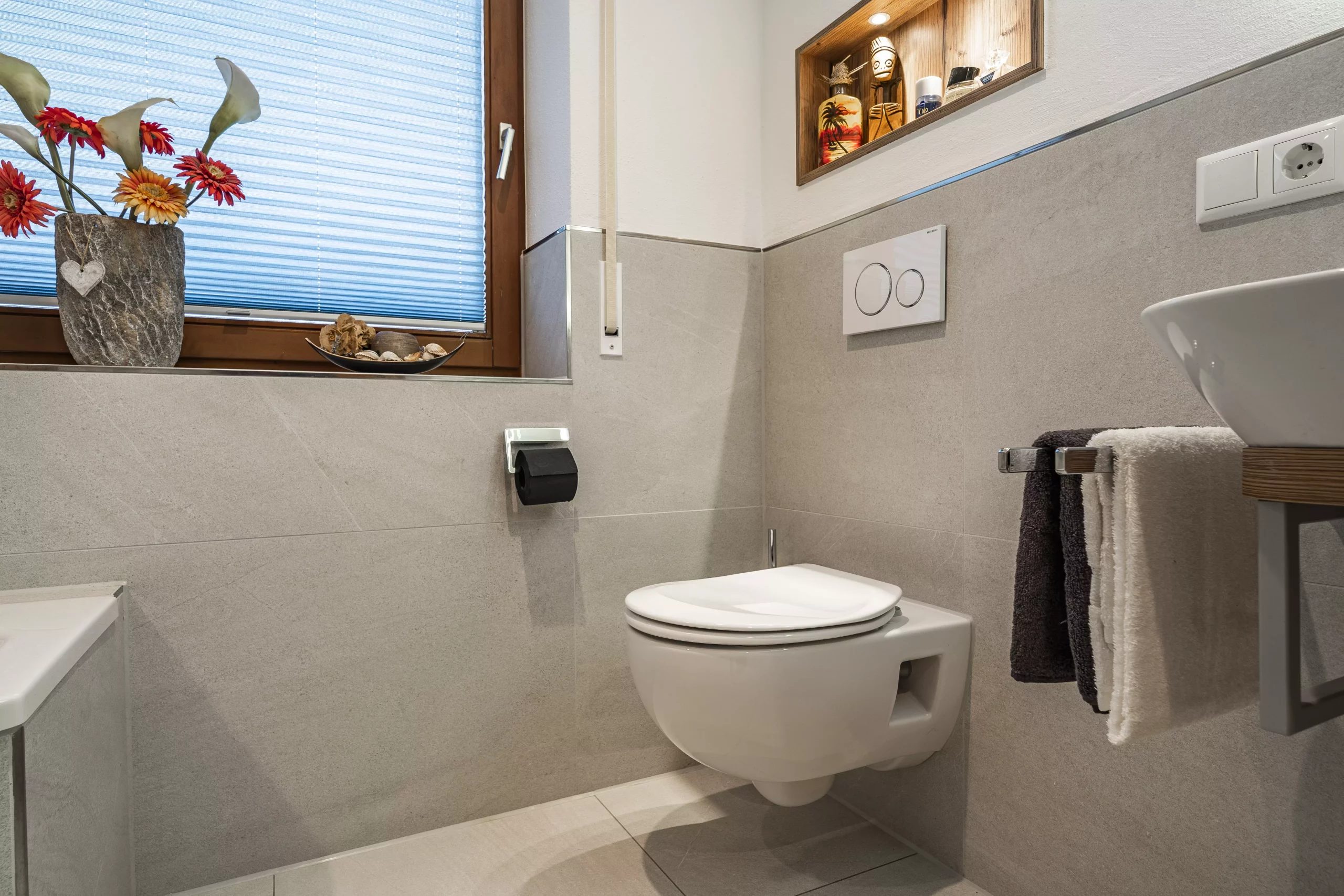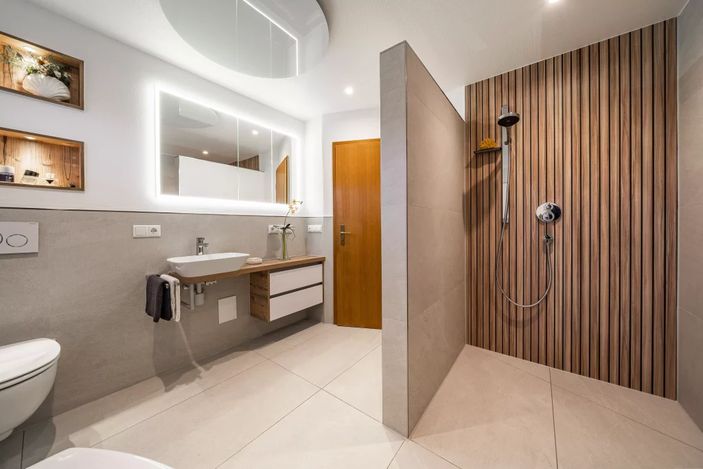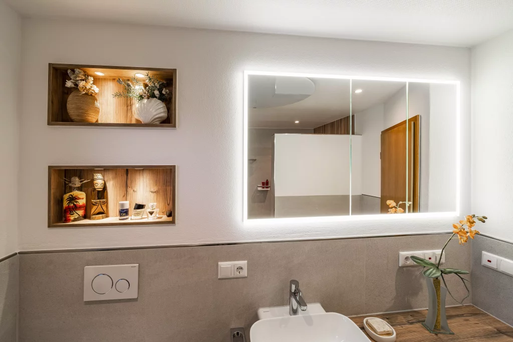 Dieses Bad ist nicht nur gut ausgestattet und absolut barrierefrei konzipiert, sondern bietet schöne Details mit beleuchteten Nischen über der Toilette für Pflegeprodukte oder zur Dekoration. Die durchdachte Beleuchtung an verschiedenen Stellen sorgt für ein schönes Ambiente. Im sehr großzügig gestalteten Duschabteil fühlt es sich, durch geflieste Holzoptik, jeden Tag nach Urlaub an. Hier findet jeder einen Ort der Entspannung.