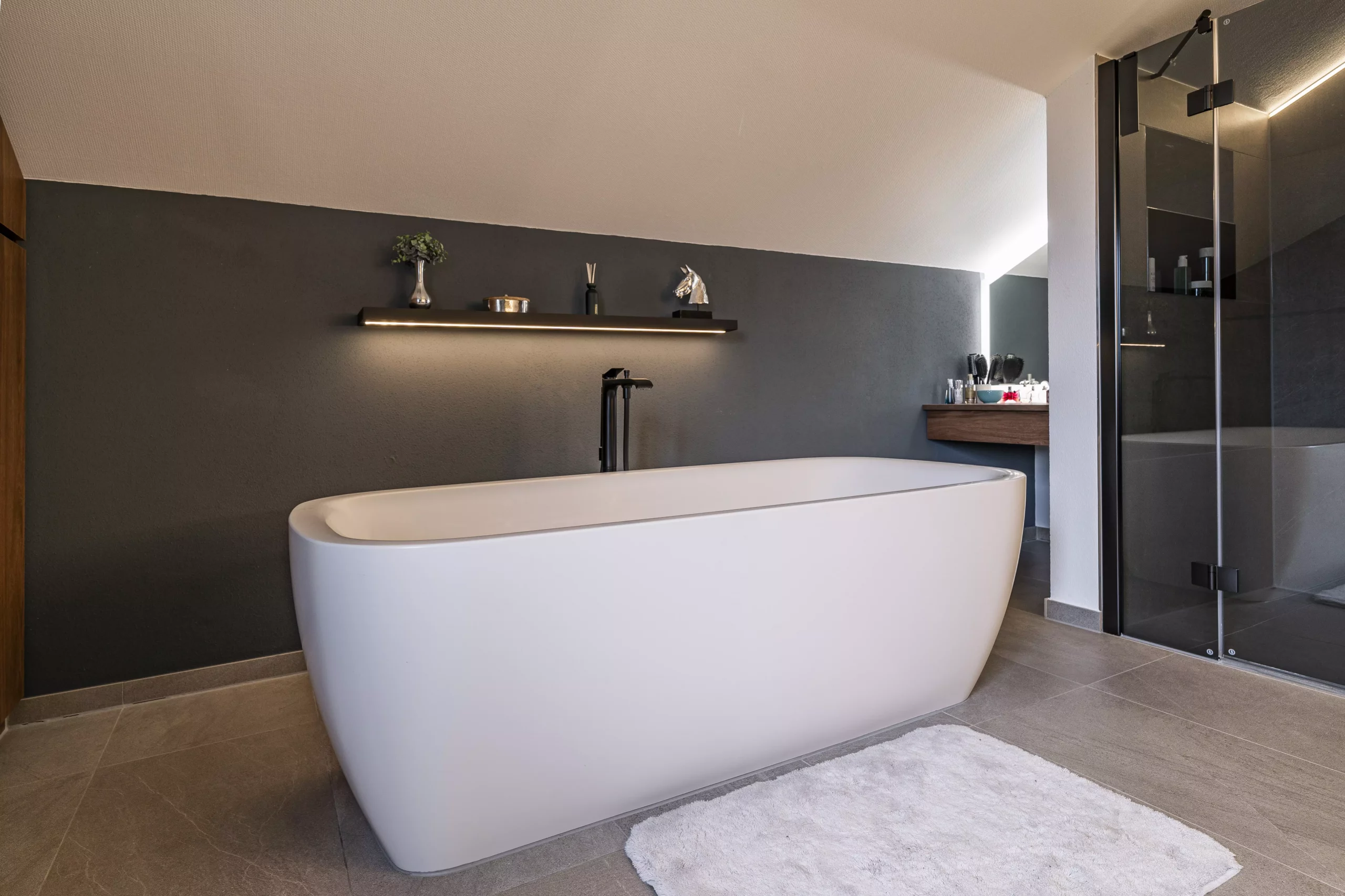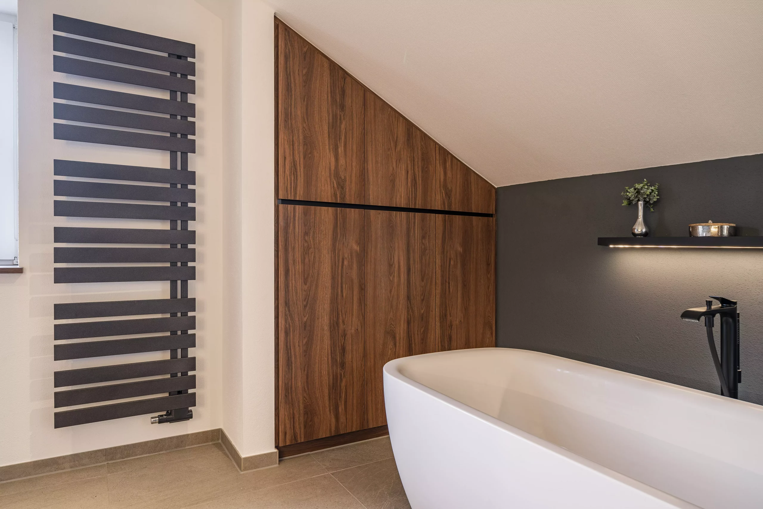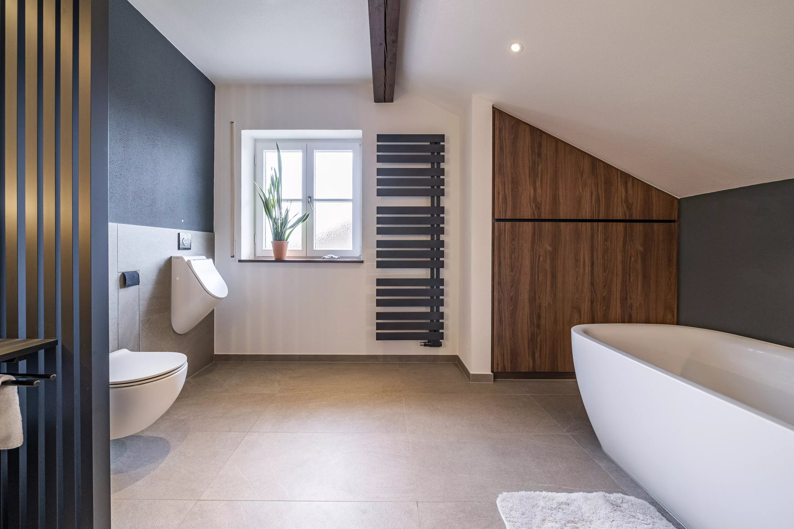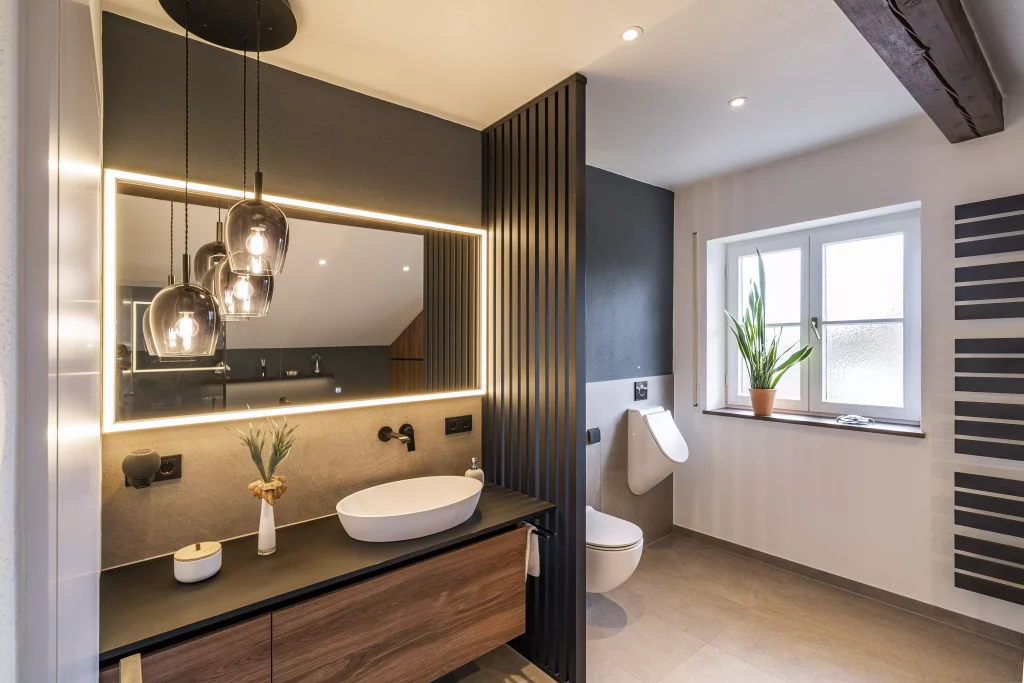 Es gab viele Wünsche und das Konzept unseres Badplaners überzeugte auf ganzer Linie. Unsere Kunden sahen sich schon in der freistehenden Wanne den industriellen Charakter der neuen Raumgestaltung genießen. Der Raum ist nicht nur ein Genuss bei einem entspannten Bad oder einer angenehmen Dusche, sondern sorgt sogar beim täglichen Schminken für eine einzigartige Atmosphäre.