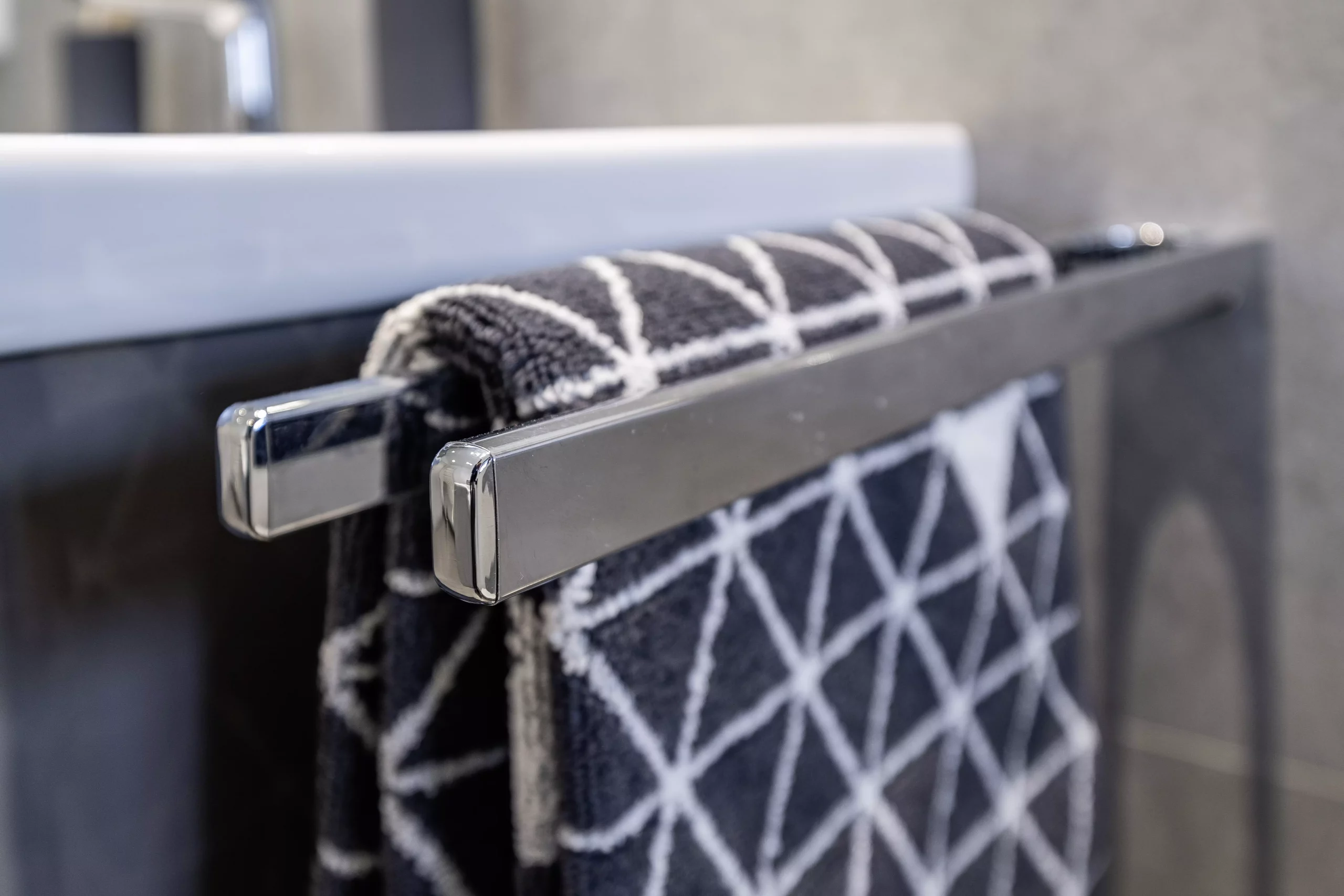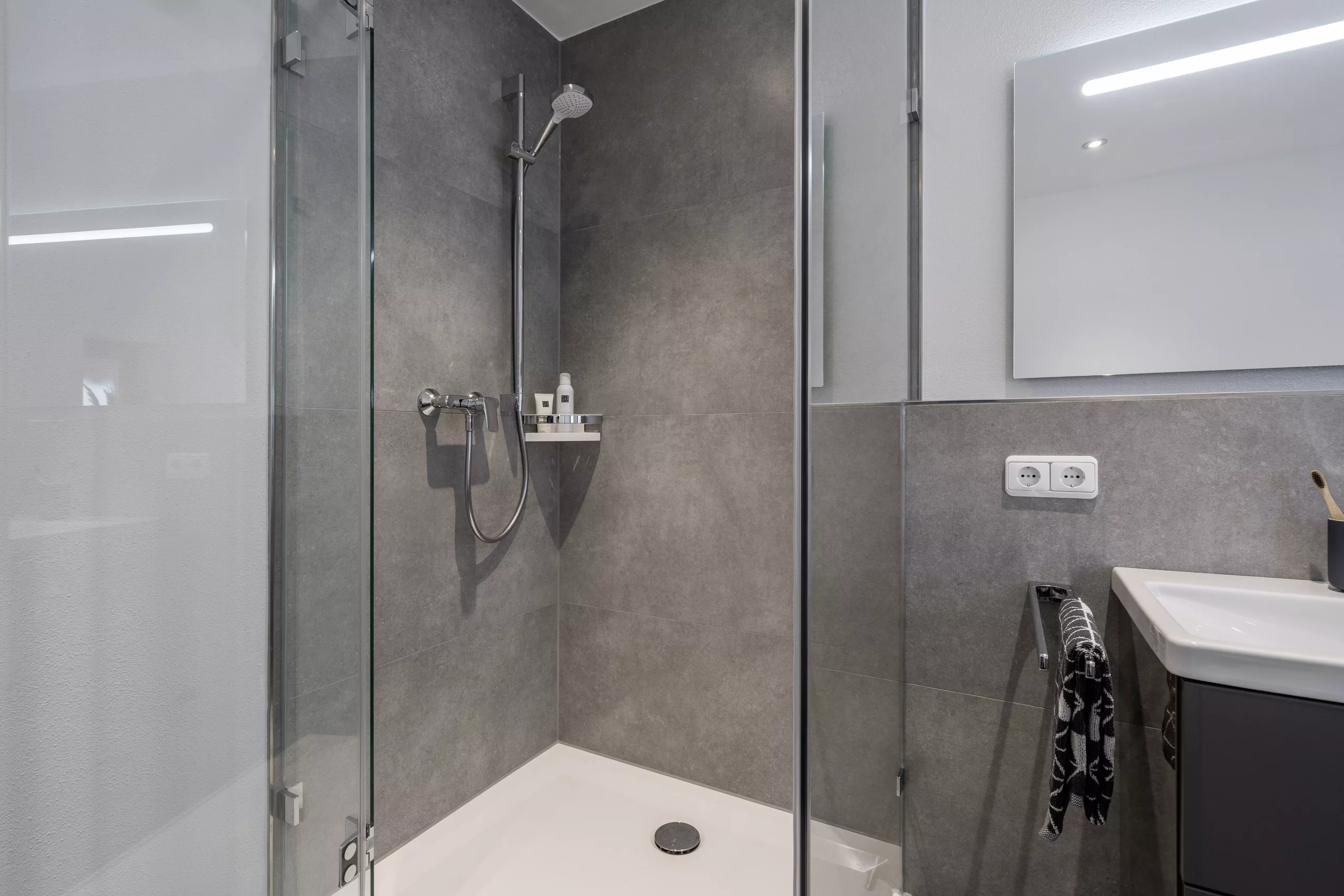 Wenn man dieses Bad betritt, findet man sich gleich zurecht und fühlt sich wie in einem Tempel der Entspannung. Die zeitlosen Details schaffen Beruhigung nach einem ereignisreichen Tag. Wie von selbst findet man den Weg in die große Duschkabine.